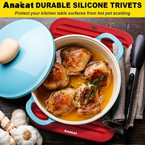 • 【MULTI FUNCTION】ANAEAT silicone trivets will not only protect your tabletop & countertop but also can be used for as bowls mat, pot mat, coasters, teapot mat, table mats, non-slip jar opener, hot pot holder, oven mitts, spoon rest, gripper pad, oven pads, drying mat or anywhere you need extra grip or extreme heat or cold protection