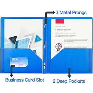 • ASSORTED COLORS & LARGE CAPACITY: The folders come in black, blue, yellow, green, and red, making it easy to distinguish their function, purpose, or categories. This allows for better file management. The two pocket prong folders have 2 inner pockets, 1 business card slot, and 3 prongs for fastening 3-hole punched paper. Each pocket can hold 50+ sheets.