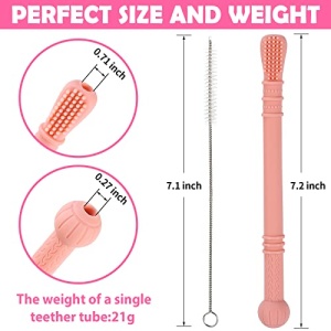 • 【EASY TO CLEAN】Our teether tubes are hollow, and we’ve included 2 cleaning brushes for easy cleaning. The teething tube is resistant to high temperatures and low temperatures, so it can also be washed in the dishwasher.