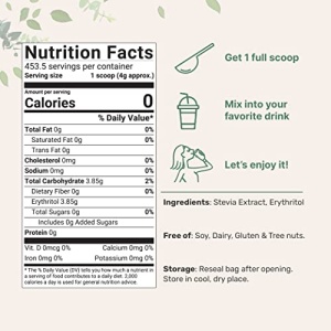 - Natural Sweetener – Highly Purified Stevia Powder with over 98% Rebaudioside A Proprietary Blend with Plant-based Erythritol Granules, Bitter After Taste Reduced, Keto Diet, Low Carb, Sugar Substitute for Baking, Drinks, Smoothie, Coffee etc…