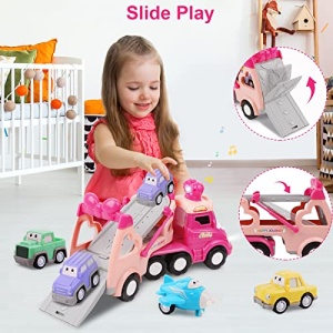 • 【5 in 1 Toy Cars Set】This 5 in-1 toddler girl car toys set for 3 4 5 6 year old includes 1 big transport truck and 3 cute cartoon cars & 1 airplane, the size of this pink crown toddler truck is 13.2*11.5*15.3 inch, the trailer part of the carrier truck has beautiful bow decoration, all toy cars have vivid colors, this toy trucks set is very suitable for children to play.