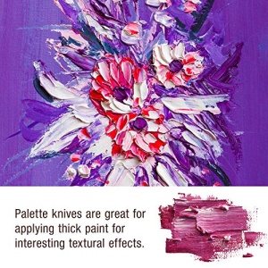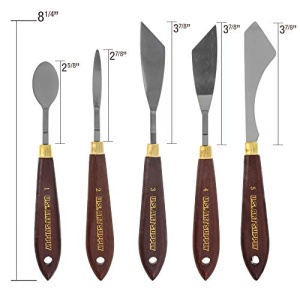 • The palette knife set includes a variety of spatula spreader shapes and sizes that are used for most types of palette knife techniques and painting applications. The stainless steel blades resist corrosion and are sturdy yet thin and flexible, making them ideal for artists to apply oil and acrylic paints onto canvases.